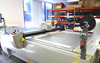 This amazing machine is larger than a king size bed. The computer tells it what shapes to cut, the fabric is loaded (up to 100 layers of fabric) with a thin plastic sheet on top & bottom, then it cuts. You can see Richard holding the blade that cuts through all those layers.